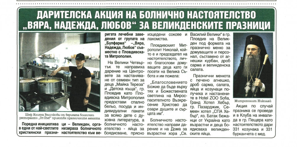 Поредна инициатива в навечерието на едни от най-светлите християнски празници – Великден, организира болничното настоятелство към веригата лечебни заведения от групата на „Булфарма“ –„Вяра, Надежда, Любов“ съвместно с Пловдивската Митрополия.