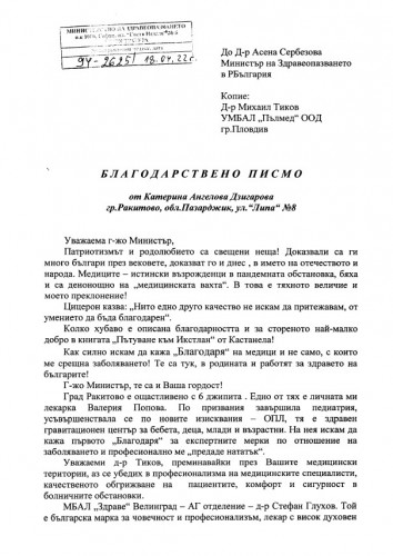 Благодарствен адрес до екипа на АГ отделението на МБАЛ Здраве, гр. Велинград